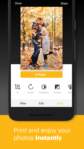 一旦您对自己的作品满意,KODAK SMILE 应用程序提供了预览和使用 KODAK SMILE 即时数码打印机打印照片的选项。或者,您可以直接分享照片到您连接的任何社交账户。
